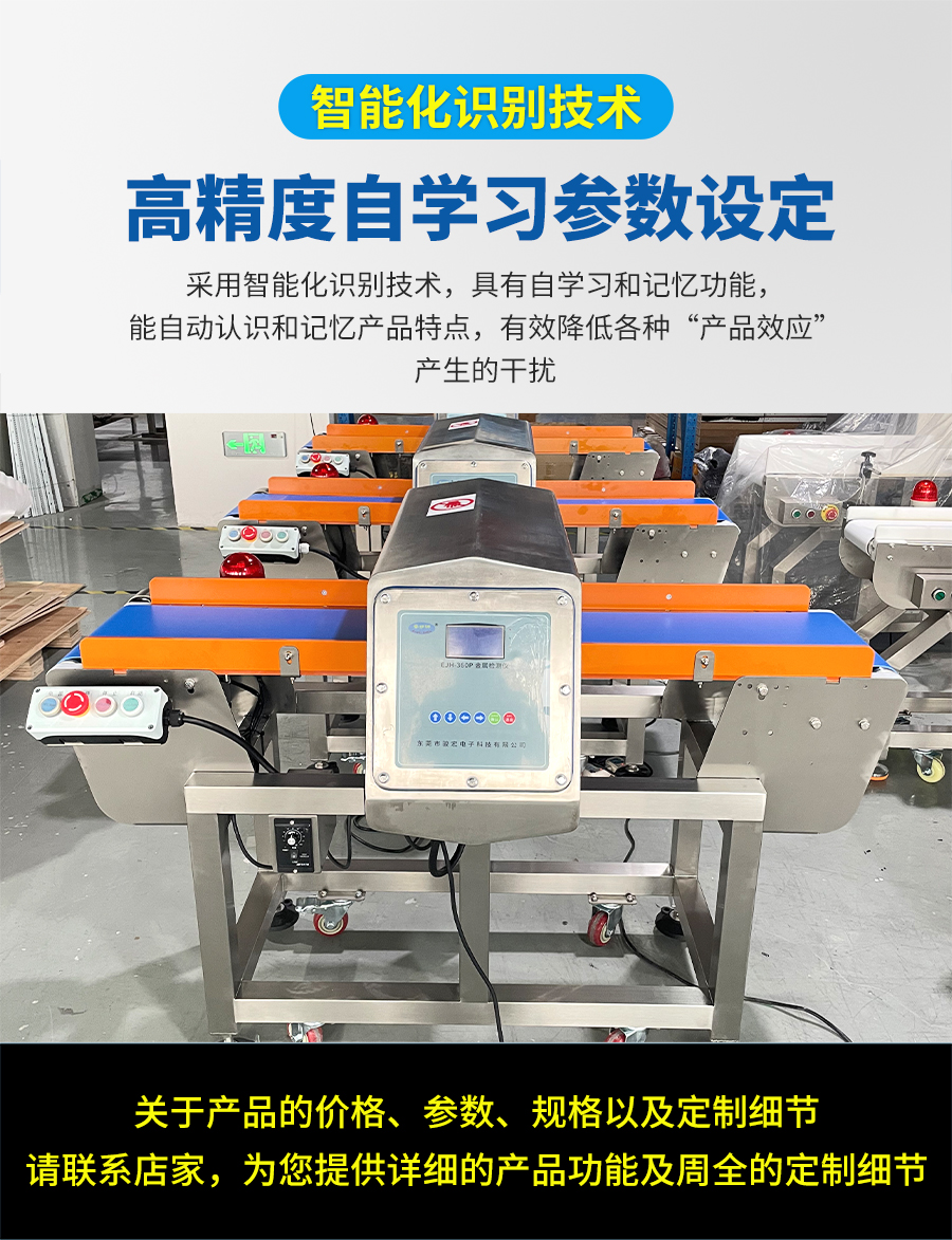安護(hù)神EJH-360金屬檢測(cè)機(jī)采用先進(jìn)的雙信號(hào)(磁感+電導(dǎo))或多頻技術(shù),精準(zhǔn)檢測(cè)鐵、非鐵(如銅、鋁、不銹鋼)等各類金屬異物,靈敏度可達(dá)Fe 0.3mm, SUS 0.5mm (具體數(shù)值根據(jù)產(chǎn)品實(shí)際性能填寫(xiě)),有效杜絕漏檢。獨(dú)特算法和屏蔽設(shè)計(jì),有效抵抗產(chǎn)品效應(yīng)(濕、鹽、酸等)和環(huán)境干擾(振動(dòng)、溫度波動(dòng)),大幅降低誤報(bào)率,保障生產(chǎn)流暢性。配備氣動(dòng)翻板、推桿、吹氣等多種快速響應(yīng)剔除機(jī)構(gòu),確保檢測(cè)到的含金屬產(chǎn)品被有效隔離,不影響合格品通過(guò)。 適用于肉禽水產(chǎn)加工、烘焙與糖果、乳制品、休閑零食、調(diào)味品與醬料、速凍食品、寵物食品、包裝材料進(jìn)料檢測(cè)等行業(yè)