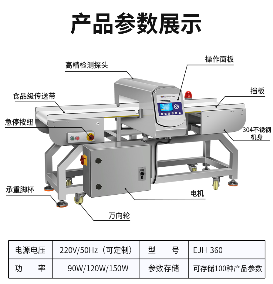 安護神EJH-360金屬檢測機采用先進的雙信號(磁感+電導)或多頻技術,精準檢測鐵、非鐵(如銅、鋁、不銹鋼)等各類金屬異物,靈敏度可達Fe 0.3mm, SUS 0.5mm (具體數值根據產品實際性能填寫),有效杜絕漏檢。獨特算法和屏蔽設計,有效抵抗產品效應(濕、鹽、酸等)和環境干擾(振動、溫度波動),大幅降低誤報率,保障生產流暢性。配備氣動翻板、推桿、吹氣等多種快速響應剔除機構,確保檢測到的含金屬產品被有效隔離,不影響合格品通過。 適用于肉禽水產加工、烘焙與糖果、乳制品、休閑零食、調味品與醬料、速凍食品、寵物食品、包裝材料進料檢測等行業