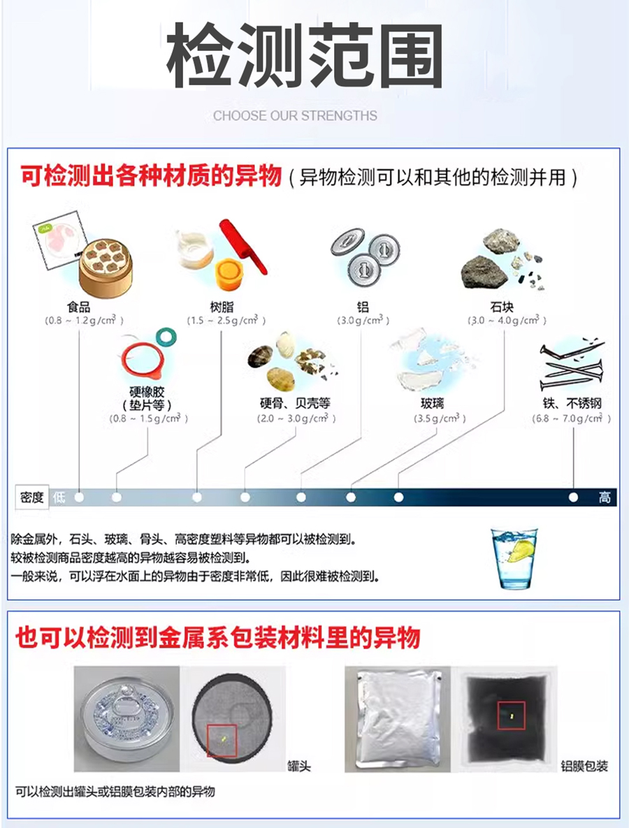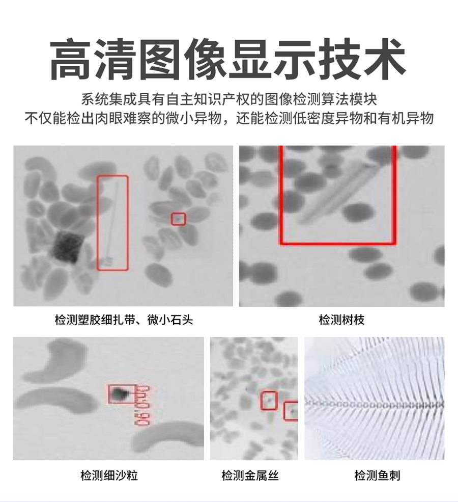 食品X光異物檢測機,檢測碎骨、金屬碎片、魚刺、魚鉤、貝殼碎片、檢測石子、玻璃、塑料、金屬等異物,高效自動檢測,降低人工成本,高精度、高速度,適用于肉類/水產/零食