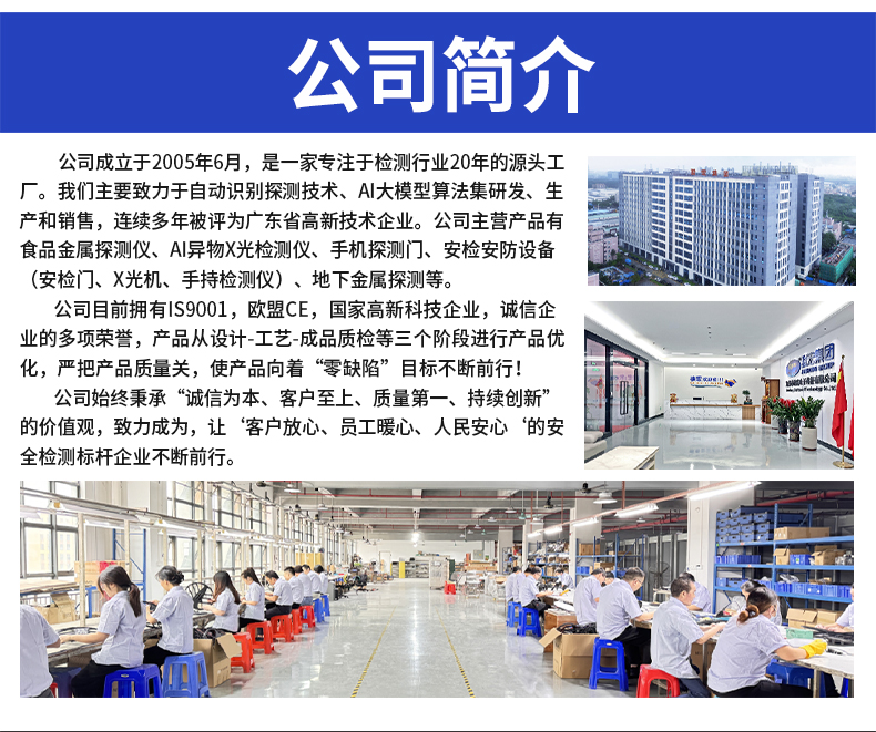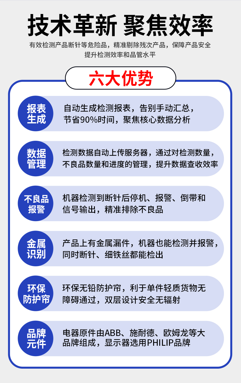 采用先進的AI智能算法頻技術,精準檢測斷針等金屬異物,靈敏度可達Fe 0.2mm,雙屏黑白高清成像,支持數據自動上傳服務器,檢測報表自動生成